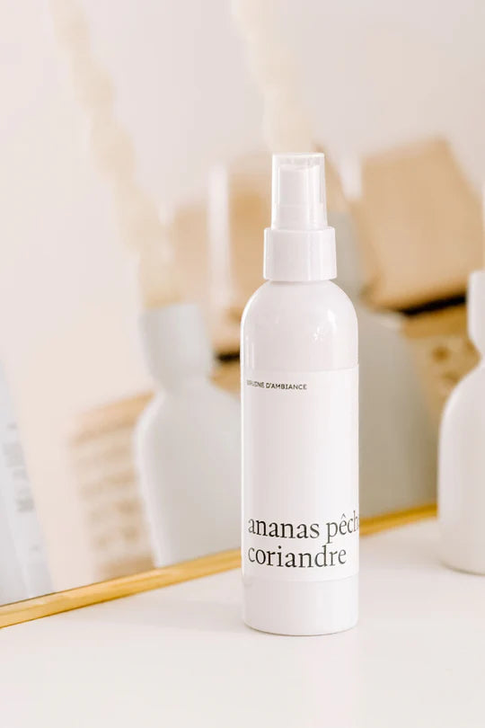 Découvrez la bruine d'ambiance Ananas, pêche et coriandre, une combinaison exotique entre la douceur juteuse de l'ananas, le goût velouté de la pêche et l'odeur herbacée de la coriandre.
