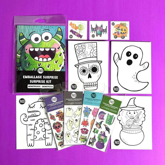 Notre ensemble surprise «Monstrueux» est conçu pour célébrer la fête de l'Halloween. L'emballage comprends des feuilles de tatouages et des petits coloriages. Parfait pour créer de beaux moments en famille ou comme petit cadeau sans sucre ou allergies.