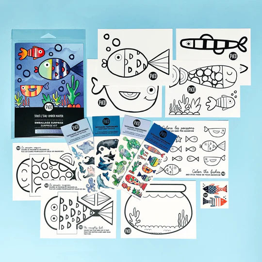 L'ensemble surprise «Sous l'eau» est parfait pour les amoureux des poissons et des fonds marins. Vous pouvez l'utliser pour célébrer la journée du poisson d'avril ou pour bricoler en famille. En plus des tatouages et des coloriages, il contient un aquarium à décorer ainsi que 2 petits poissons mignons à bricoler en 3D.