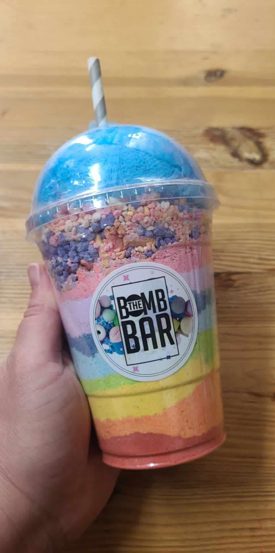 Le populaire verre à slush est rempli de poudre de bain moussante avec des roches et une houppette bleue.